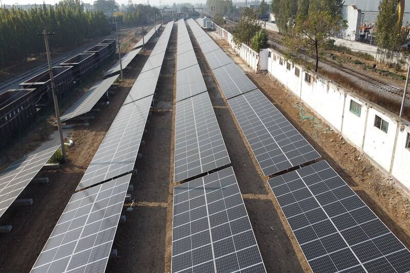 该项目采用“全部自发自用”的模式,规划装机容量约1MW,安装1818块550Wp单晶硅组件。发出的交流电经交流电缆接入机务厂区低压配电舱,再经箱式变压器升压后,接入中央变电所备用柜。