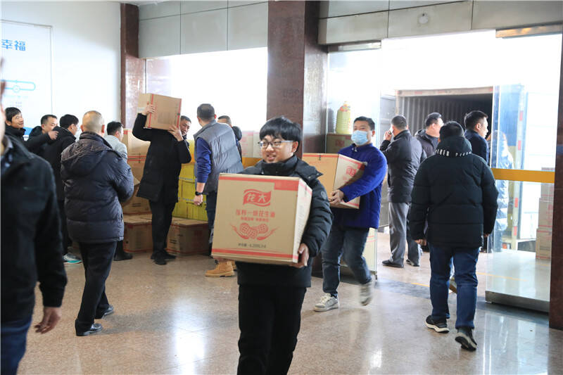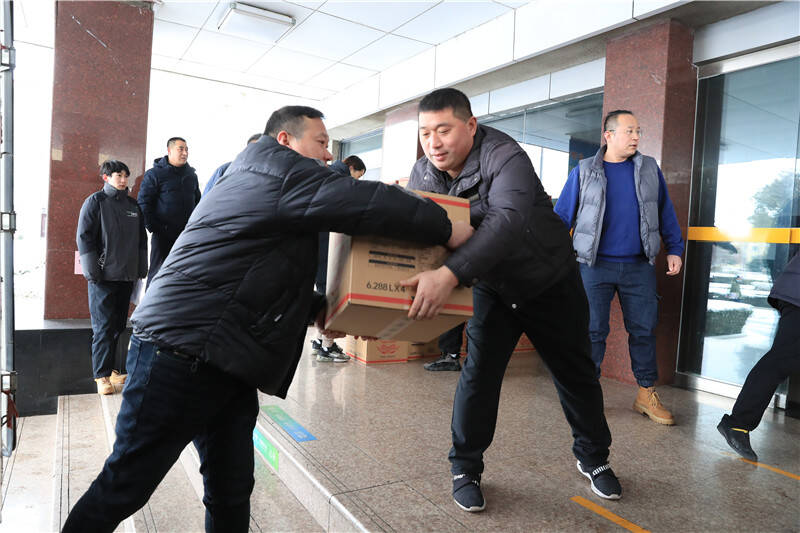 在福利发放现场,洋溢着一片温馨和谐的氛围,大家你来我往、相互协作,搬运、核对,工作人员忙得不亦乐乎,职工连胜流露着幸福的笑容。虽然天气寒冷刺骨,却挡不住职工的热情,有手捧肩扛的,有用手推车拉的……现场一片热火朝天的景象。