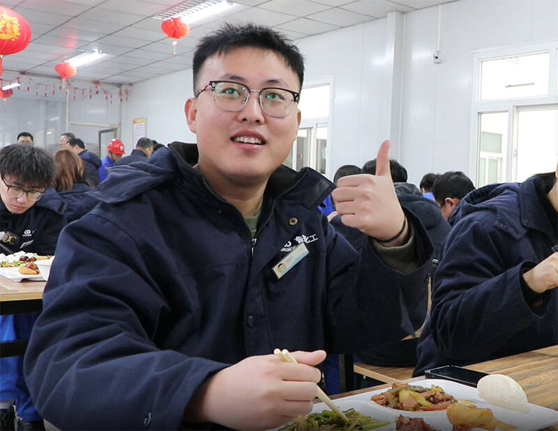就餐的职工们个个笑容灿烂明媚,大家互祝小年快乐,边吃边畅聊着更加美好的未来。