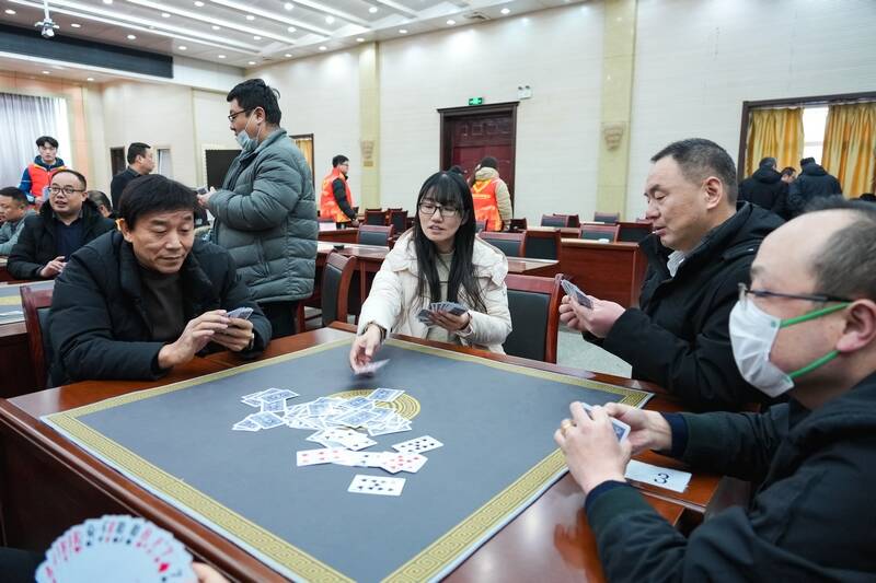 比赛现场,大家抽签后来到了各自号码对应的桌前,8桌16组同时开赛。参赛选手之间密切配合,有的深思熟虑,沉着出牌;有的豁然开朗,激动甩牌,大家斗智斗勇,比赛一波三折,现场处处洋溢着紧张又祥和的气氛。