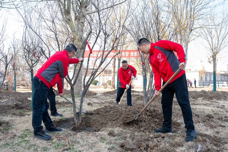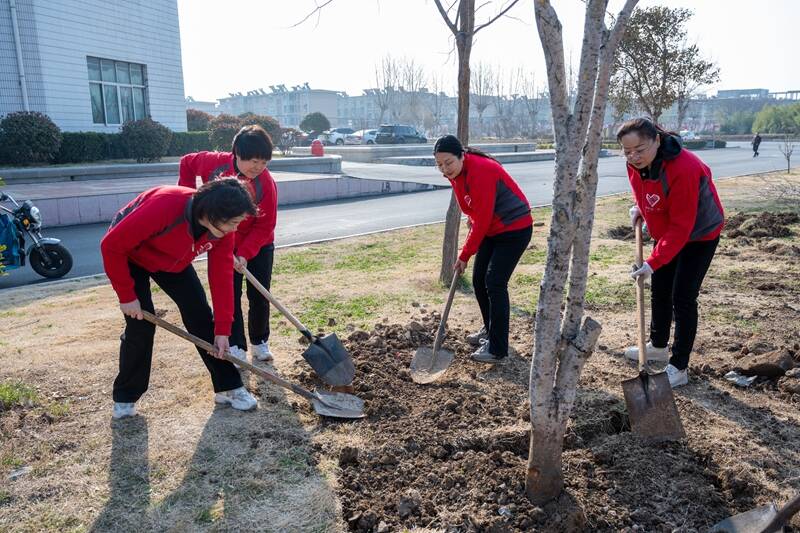 植树活动现场,大家热情高涨、干劲十足,按照划分的种植区域,两人一队,三五成群,挥动手中的铁锹,挖树坑、放树苗、培土、踩实、浇水,互相协作、配合默契,每个环节都井井有条,现场呈现一派热火朝天的劳动景象。经过大家的共同努力,金贵、海棠、月季、青竹、黄金槐等新种植的近百棵植物迎风而立,在阳光的照耀下焕发着勃勃生机。