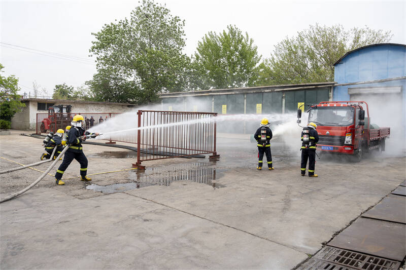 演练现场,消防人员通过消防水带喷水迅速冷却装卸车辆及油桶堆,再利用干粉灭火器扑灭油桶堆明火。参演人员对现场泄漏的废油采取围堰堵截、覆盖、收容、废弃等处置方式,对现场进行清理打扫,并向抢险救灾组汇报抢险任务完成情况及险情控制情况。