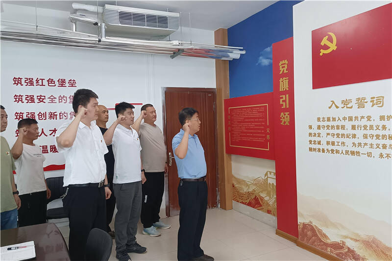 该矿各基层党支部组织党员干部举行宣誓仪式,党员们高举右手,面向党旗庄严宣誓,重温入党誓词,追忆入党初心,表达庄严承诺和坚定决心。