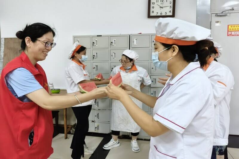 “大家辛苦了,赶紧来吃块雪糕、喝个西瓜降降温,休息一下。”