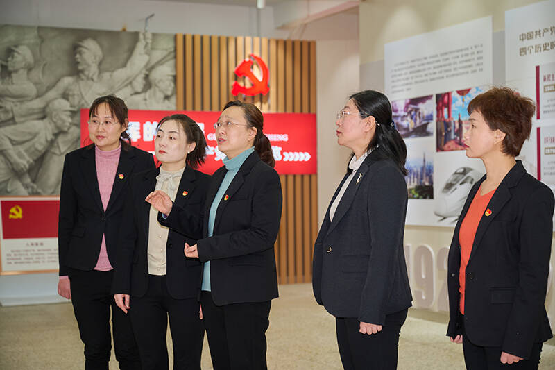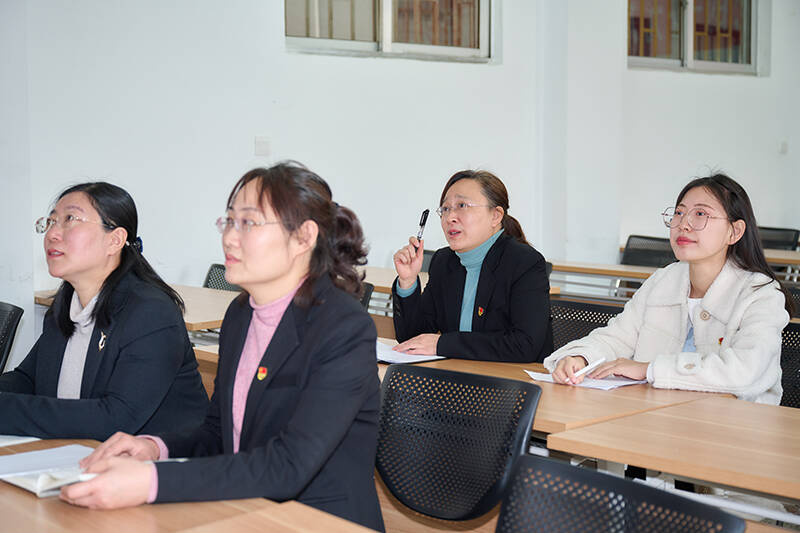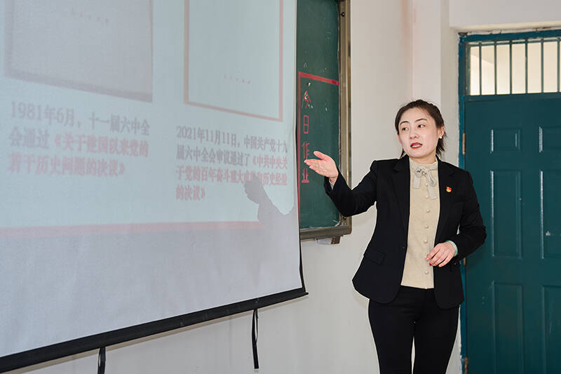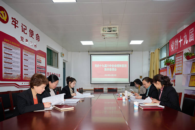 党的十九届六中全会召开后,第一时间组织老师进行培训,集体备课,列大纲,老师们领任务后再试讲,形成了个人讲课风格。日常工作生活中,不断收集资料,每个月组织老师学习交流、知识共享。时间紧,任务重,女教师们结合宣讲内容自己制作课件,熬夜备课是常态。