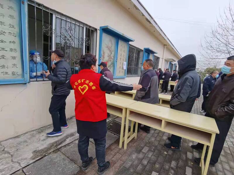 在同一时间立即响应的还有一直活跃在该矿各个角落的暖心志愿者,3月14日早8点,数十名志愿者主动请缨,在做好自身防护的前提下,来到该矿核酸检测点开始为待检人员维持秩序、抬桌椅、拉警戒、设测台......