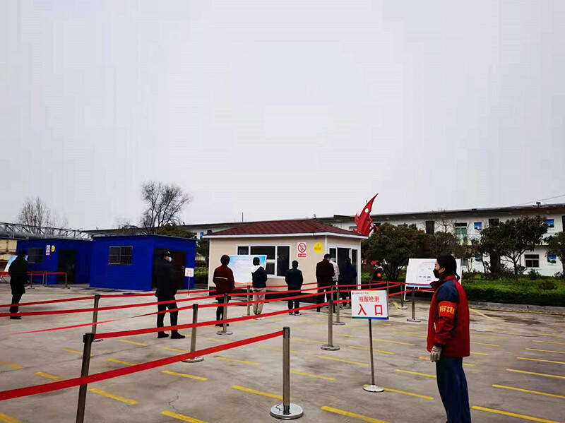 检测现场,志愿者们维持现场秩序,提醒职工们严格落实佩戴口罩、测体温、“1米线”等要求,确保检测过程井然有序。