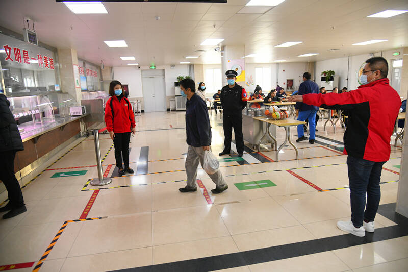 “您好,请配合一下体温检测。”“请保持一米线距离。”“请出示下您的健康码和行程码。”在职工食堂,暖心者愿者采取轮流排班、接续值守的方式,为每一名就餐的职工进行体温测量、验证码查验、防疫措施提醒,凝心聚力共抗疫情。
