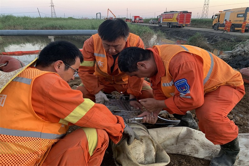 大家争分夺秒与时间“赛跑”,由于现场铁锹、铁铲等工具不够,大家就直接用手奋力挖除淤泥和砂石,分工明确、密切配合,迅速铺设排水管路。