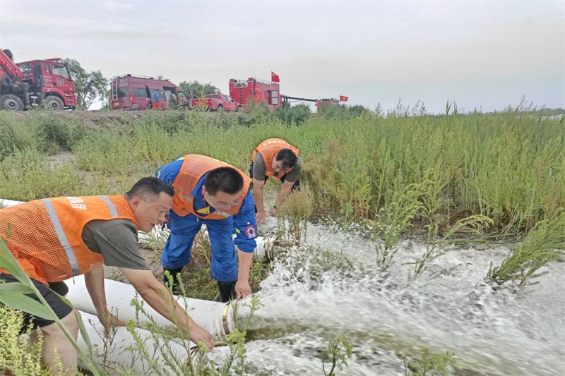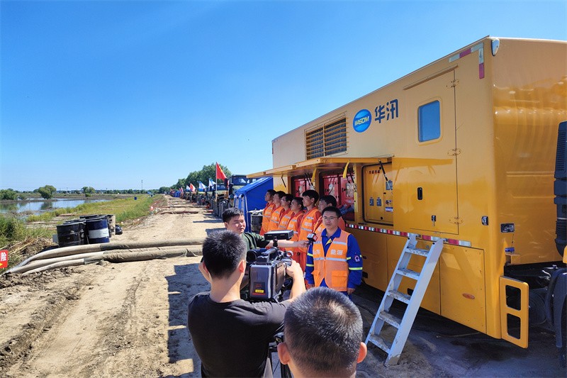 出征26小时后,8台排水泵实现满负荷排水,排水量高达4000立方米/小时的大功率“龙吸水”排水车进入全力“吸水”模式,一台台大功率排水泵将堤坝西侧淹没区域内的洪水源源不断的排放到绕阳河河道。