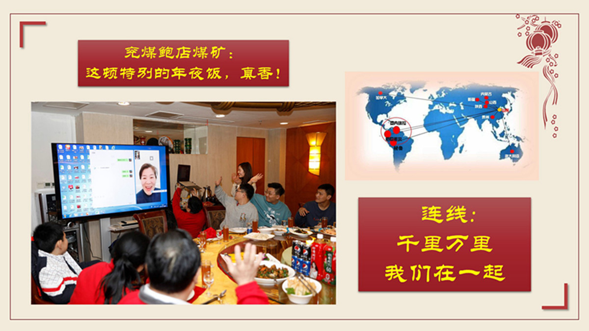 【编者按】“妈,过年好!你看,我们这里可热闹了,矿领导陪我们新入职员工一起过年呢……”大年除夕,鲍店煤矿选煤中心新入职员工刘娜和远在安徽的母亲通过大屏幕视频连线,开心自豪地向远在家乡的母亲展示着矿领导和暖心志愿者共同构织的过年画面。“千里万里,我们在一起。”今天的【连线】,让我们一起感受兖州煤业鲍店煤矿特别香的年夜饭、家感觉——