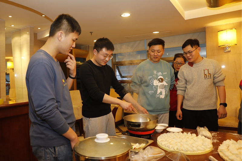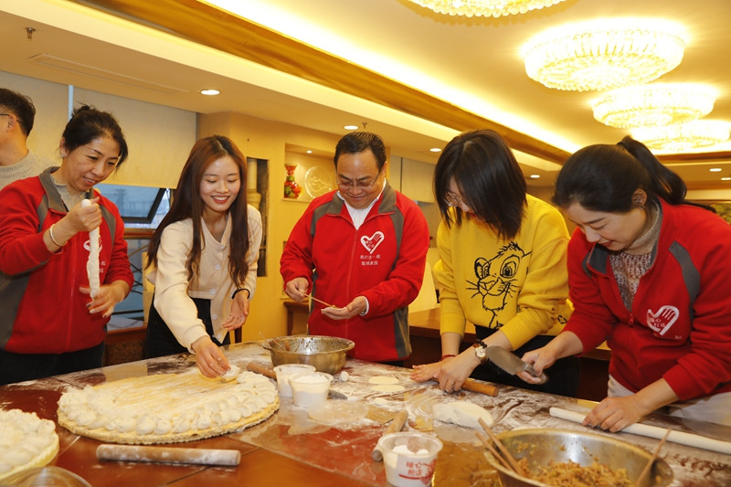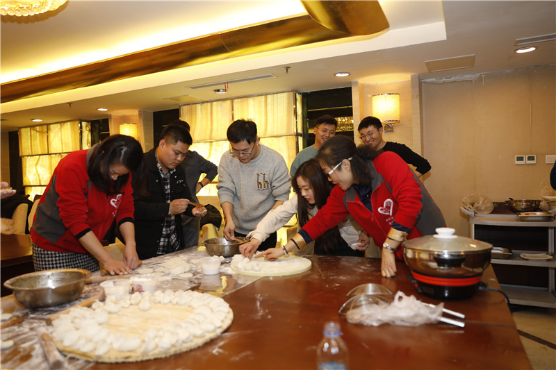 17:30分,新入职员工纷纷来到这里。多彩的气球、喜庆的中国结、牛年的毛绒玩具……看到现场温馨的布置,他们的脸上都露出惊喜的表情。他们与志愿者一起,和面的和面、调馅的调馅、擀皮的擀皮……大家一边聊着家常,一边比赛谁包的饺子又快又漂亮,忙得热火朝天。