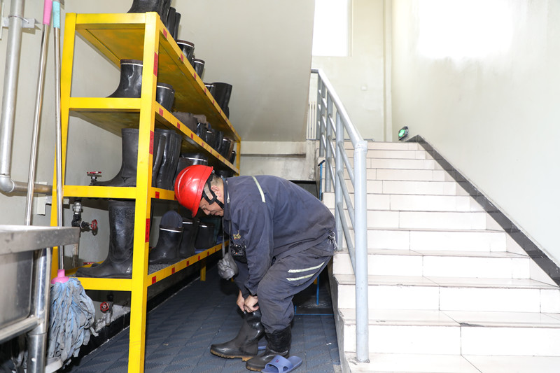 为改善备煤车间职工的工作环境,在该车间党支部书记刘文的建议下,他们在备煤车间现场巡检房东侧为职工制作了一个冲洗池。从现场回来的职工,先在冲洗池里将雨靴上的煤泥煤灰冲洗掉,走进巡检房一楼,在他们自制的脱靴器前脱下雨靴、换上拖鞋,走向二楼更衣室,换上自己的衣服,就可以干干净净、清清爽爽地下班了。巡检房二楼配备了热水器、洗手液,可供职工清洗手上脸上的煤尘。