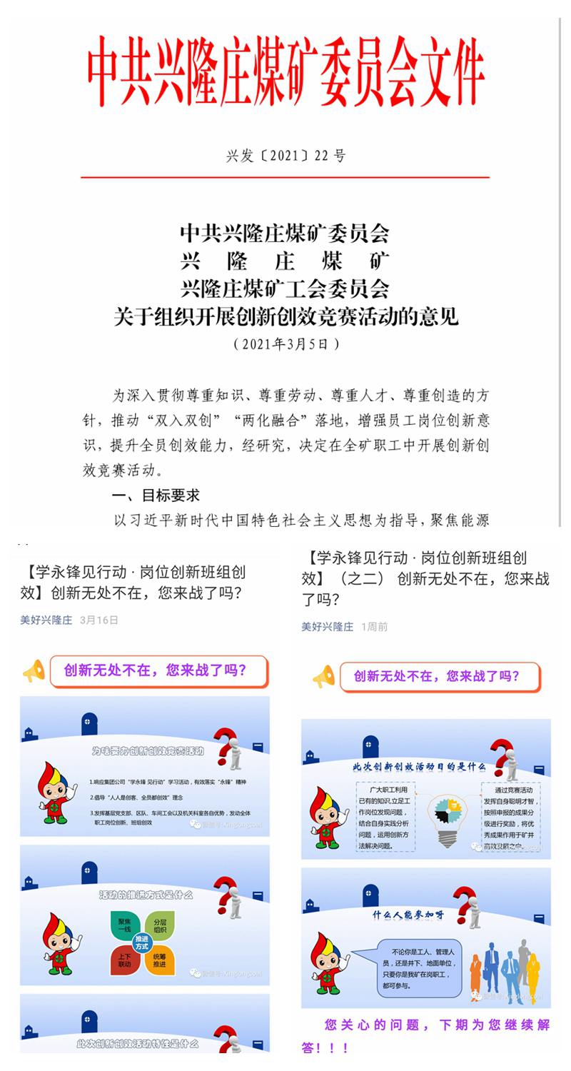 创新是第一动力、活力之源;创效是企业属性、永恒主题;职工最具创新创效潜力。3月初,兴隆庄矿党政工联合行文,下发《关于组织开展职工创新创效竞赛活动的意见》,通过融媒体平台,对竞赛目标要求、活动内容、申报条件、组织方式、考核奖励等进行广泛宣传,进一步明确突出职工创新创效主体,融入矿井中心任务,统筹各方资源,协调运行机制,纳入专项考核,强化指导督导,为职工立足岗位、自主创新提供全方位的政策支持和开放、包容、共享的良好环境,让一批职工创造、职工制造、职工改造创新成果,从星星之火迅速呈现燎原之势,激活“聚焦创效、激励创效、全员创效”活水,引导广大职工在创新中挑战自我,在创效中建功立业。风劲潮涌逐浪行,储能蓄势辑杨帆。聚焦能源集团“七个一流”目标、兖州煤业高质量发展和矿井“十四五”规划中心任务,兴隆庄矿融合“四型矿井”建设磅礴动能,以思想破冰的锐气,自我革新的勇气,加满油,把稳舵,鼓足劲,用好职工创新创效驱动引擎,激发全要素活力,厚植健康可持续发展优势,不断向着美好兴隆高质量发展征程阔步前行。
