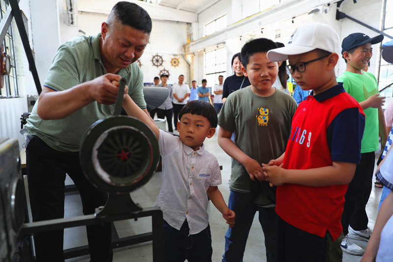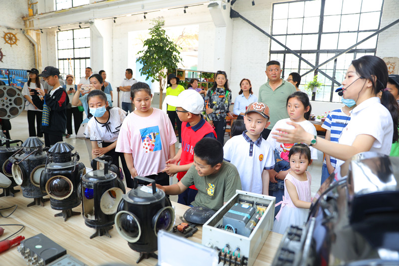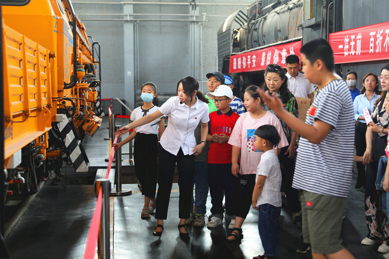 在工务段养路机械工区展厅,气势磅礴的蒸汽机车显得饱经岁月沧桑,成了难以磨灭的记忆。职工子女认真聆听工作人员介绍铁运处火车发展史及机车的变化,近距离看飞驰的车轮和神秘的火车,增加了对父母工作单位的了解。