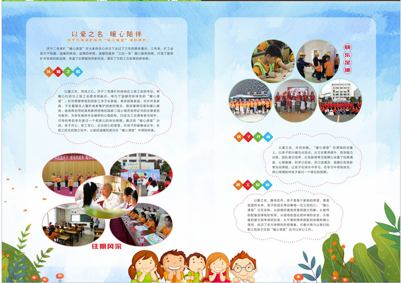 【编者按】学党史,办实事。随着暑期的到来,孩子们的假期怎样过才能更加充实、快乐、有意义,成为山东能源集团工会女工委摆到工作议程的一件“暖心事”。为解决驻外职工、双职工和创业职工子女“看护难、辅导难”等问题,部分基层单位工会女工委办起了“暑期托管班”,解决了职工的后顾之忧,让“小候鸟们”有了“爱心巢”,把职工们的“挂心事”变成了“放心事”。为此,网站分为上下辑,对兖州煤业济二煤矿、兖州煤业鲍店煤矿和新矿集团、翟镇煤矿相关亮点做法进行图文报道和解读,便于单位之间线上分享交流。
