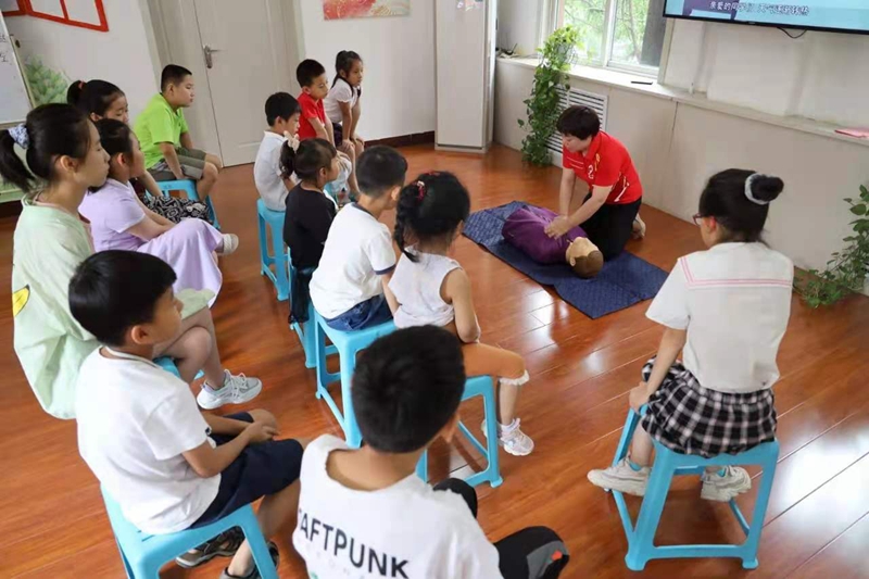 呵护儿童,关爱成长。暖心志愿者马红霞以我说你指的游戏进入课堂,以“普及、提高儿童防范意识”为宗旨,致力于守护儿童的身心健康。“双手要像这样交叉重叠放在胸口......”, 志愿者刘丽带着道具给孩子们上了一堂精彩的心肺复苏课,燃起了孩子们救助他人的英雄之心。夏令营还开设了安全小卫士和消防安全科,旨在培养孩子们的安全意识,在生活中和学习中筑牢安全防线。