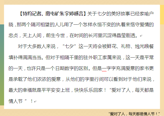 随着企业的开发,驻外的职工越来越多,有更多的职工成了“牛郎和织女”,他们聚少离多,没能天天在一起,没能时刻相守在一起。有更多的人深深体会到了什么是牵挂,什么是思念。他们不能向守在身边的情侣你给我拥抱,我给你微笑,更多的是你给我踏实,我给你温暖,他们用行动诠释着“两情若是久长时,又岂在朝朝暮暮”的誓言。他们相信,真心相爱的人,每一天都是鹊桥相会的浪漫,都是佳期如梦的甜蜜,都是拥抱温暖的幸福。虽然他们都明白所有的深情,都不及久伴,都希望彼此朝朝暮暮,从繁花到落幕,从晨曦东起,到艳霞西落。可只因爱,只因为责任,他们学会相互懂得和理解,也学会控制自己的小脾气。因为忙碌,电话少了,短信没了,可对方受的苦,流的泪,彼此无言也懂你。