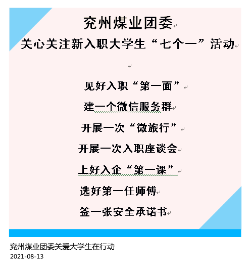 【编辑感言】"凝心聚力,筑梦启航"——伴随着新分大学生正式成为企业新成员,兖州煤业团委关心关爱大学生在行动,专门印发《共青团兖州煤业股份有限公司委员会关于开展关心关注新入职大学生“七个一”活动的实施意见》,旨在“统筹抓好公司新入职大学毕业生的服务与管理工作,帮助他们尽快完成从学生到企业员工的角色转变,适应工作岗位、了解企业环境、树立爱企爱岗意识。”
