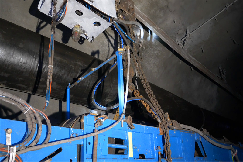 据东滩矿掘进二区区长孔祥玉介绍,他们通过在沿皮带中线方向巷道顶板上安装单轨吊梁,使用风动单轨吊车吊挂牵引桥式转载机方式,实现转载机灵活移动,紧跟侧卸机出矸。迎头倒矸时,风动单轨吊车牵引桥式转载机前移至出矸位置,使用侧卸机就近铲矸卸入桥式转载机,矸石经桥式转载机转运至后部搭接的皮带上完成外运。