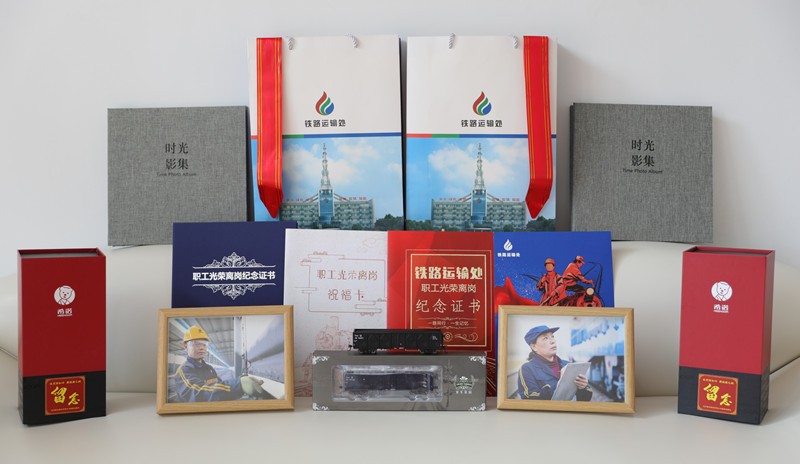 一本精心定制的光荣离岗纪念证书、一张写满身边工友祝福话语和心里话的精美贺卡,一台精致的火车车辆模型、一封满含不舍与殷殷嘱托的离岗信笺、一套个人工作写真照片……铁运处党政为每名退休职工精心准备的、包含9样礼物的“光荣离岗纪念套装礼盒”,把对职工的温暖和关爱从企业延伸到家庭。