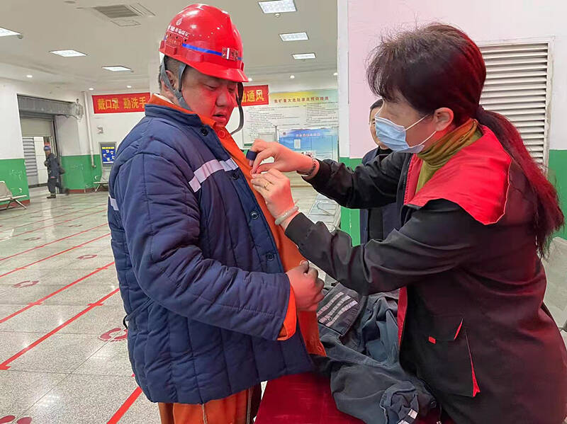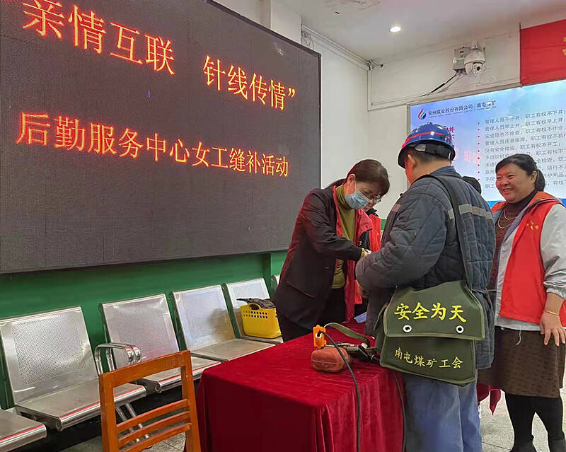 在南屯矿井口大厅,女工协管员们一边为上下井的职工缝补工作服,一边细心叮嘱着矿工师傅注意安全。她们不计较煤灰、不介意汗味儿,仔细对待每一件需要缝补的“作战服”。一句句暖心的叮嘱、一个个结结实实的纽扣,温暖洋溢在井口大厅。