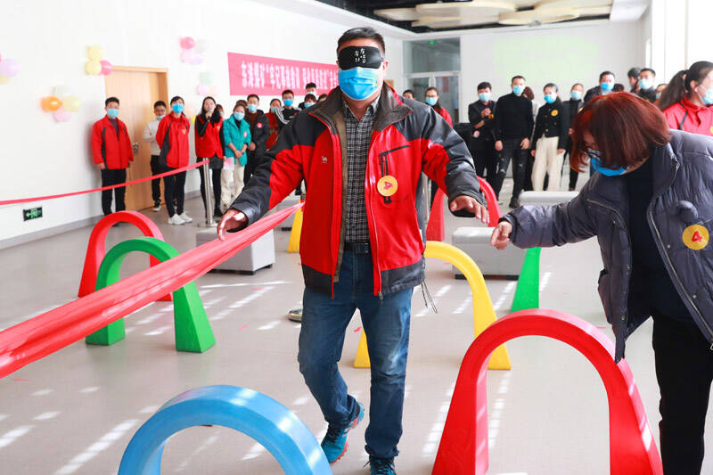 在随后进行的蒙眼过障碍环节中,14组家庭分为两队,丈夫佩戴眼罩,妻子一旁指挥,在划定区域内,按照规定路线越过障碍物前往指定白板,共同写下一句安全承诺,再原路返回至出发点,依次接力直至最后一组家庭。伴着现场阵阵欢笑声和加油声,两组家庭同时出发,在妻子的耐心指挥下,丈夫小心翼翼通过一个个障碍,真实感受“双目失明”后给生活带来种种不便,切身体验事故造成的残酷后果,给人以警醒和深思。