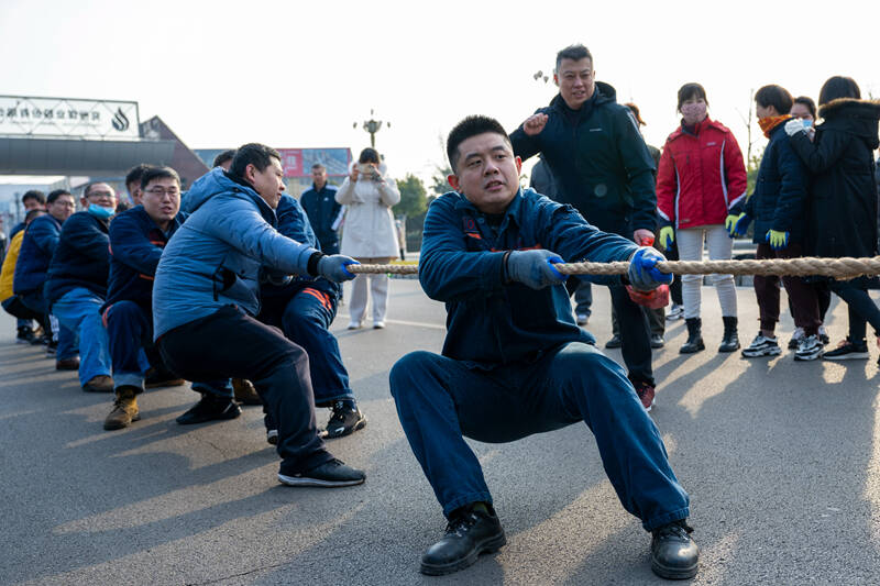 在拔河比赛的赛场上,各参赛队队员相互鼓劲加油,拉开“弓字步”,凝神聚气,一触即发;只听裁判哨响,各个队员紧握绳索,身子稍往后倾,咬紧牙关,使尽全身力气将绳索往各自队伍方向拉拽。各队啦啦队员涨红了脸,拍打着手势,为场上队员加油鼓劲,气势丝毫不逊于参赛队员,现场呐喊声、加油助威声此起彼伏。在“同舟共济”趣味比赛的赛场上,所有队员跨在龙舟上,手抓着舟身上的把手,双脚不停“划动”,带动龙舟前进。队员们默契配合、左右左右,步伐整齐。观众们加油鼓劲声不绝于耳,整过活动现场洋溢在一片欢乐和谐的氛围中。