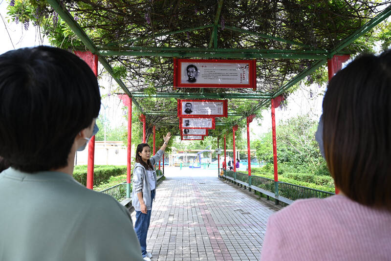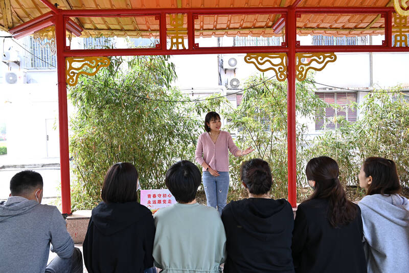 与此同时,在该矿党史文化广场的紫藤花架下同样进行着一场主题团日活动。