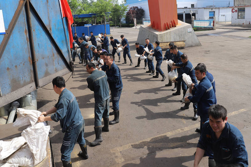 18支防洪抢险队伍迅速集结,副矿长李昌杰一声令下,300多名职工立即携带防洪物资迅速奔向35KV变电所、主副井口、通风机房等地点筑起防洪墙,严防洪水进入井口和重要场所。