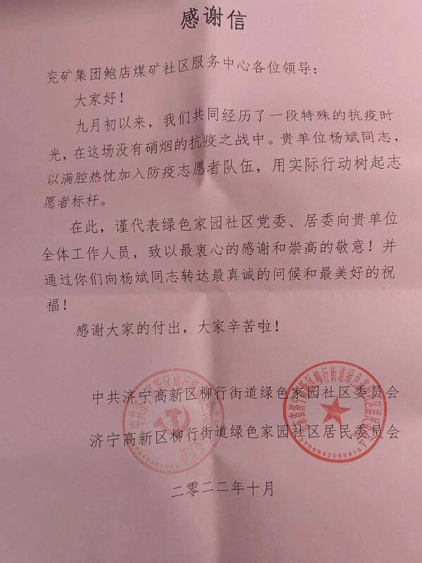 近日,鲍店煤矿社区服务中心收到一封来自济宁高新区柳行街道绿色家园社区寄来的感谢信,表达对杨斌同志的感谢之情。