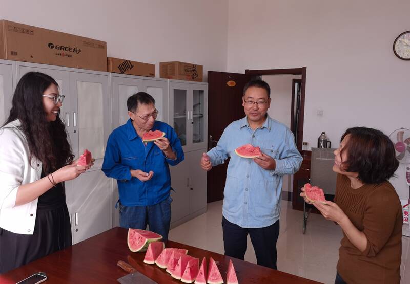 近日,物流公司西北分公司查汗淖集运站的西瓜熟了,职工们品尝着自己栽种的西瓜,分享着期盼已久收获的喜悦。