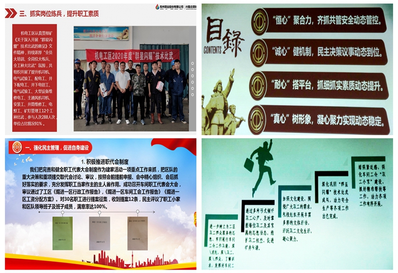 该矿工会以创新为动力,以发展为目标,以美好为追求,以服务为主责,赋予基层工会自主管理的模式,自我对标找差距,自我创新抓推进,自我加压抓提升,不断提高服务矿井安全生产工作、维护职工合法权益、竭诚服务职工的能力。该矿综采二区以提升职工队伍素质、促进矿井科技创新为着力点,加强劳模(技能大师)创新工作室规范化建设,深化“五小”科技革新项目的激励机制,开展小发明、小革新、小改造、小设计、小窍门、小问题、小工具“七小”合理化建议征集活动,为工区安全文明生产、材料回收和降本增效工作发挥了积极作用。该矿综掘一区车间工会从安全生产、质量标准化、进尺等方面,每月组织开展“优秀班组”、“优秀班组长”评比竞赛活动,评选45名优秀员工,15名先进员工,发动职工群众参与其中,及时给予奖励认可。
