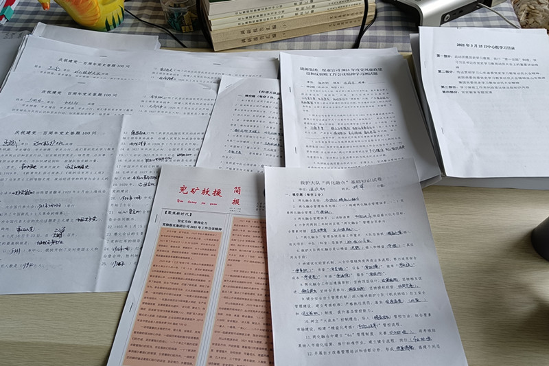 记者继续“扫描”刘菲那张内涵颇为丰富的书桌:这边是一摞“能源集团2021年度党风廉政建设和反腐败会议精神学习测试题”“庆祝建党一百周年党史答题100问”,那边是兖煤救护大队‘两化融合’知识答卷”“和谐大队建设知识答卷”;这厢是2021年中心组学习目录,那厢是“党史学习教育‘工作计划配档表’”……那一瞬间,有八个大字进入我的脑海——“学以致用 知行合一”。