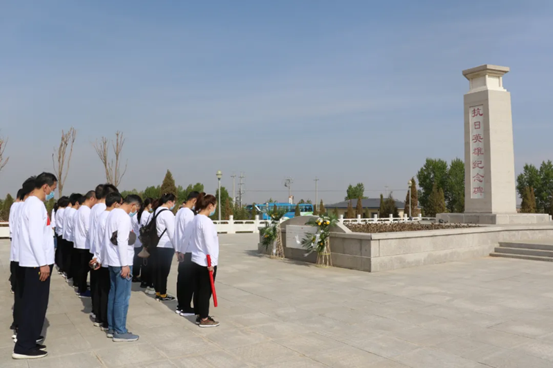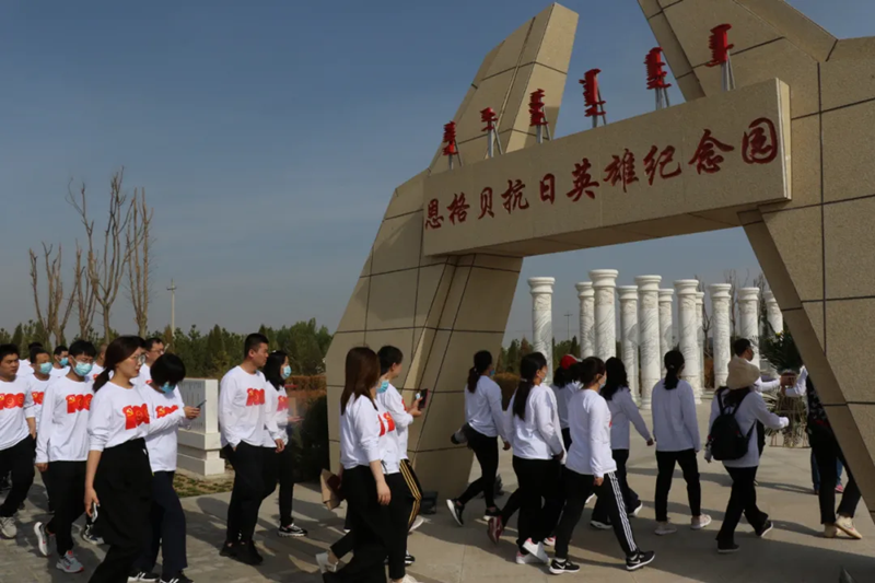 在恩格贝抗日英雄纪念园,敬献花篮、瞻仰革命烈士抗战碑文、浮雕,聆听西沟沿战役经过,为烈士们默哀。特别是聆听到惨烈的战斗过程,一行人员一次次被震撼,更加感悟到和平的来之不易。