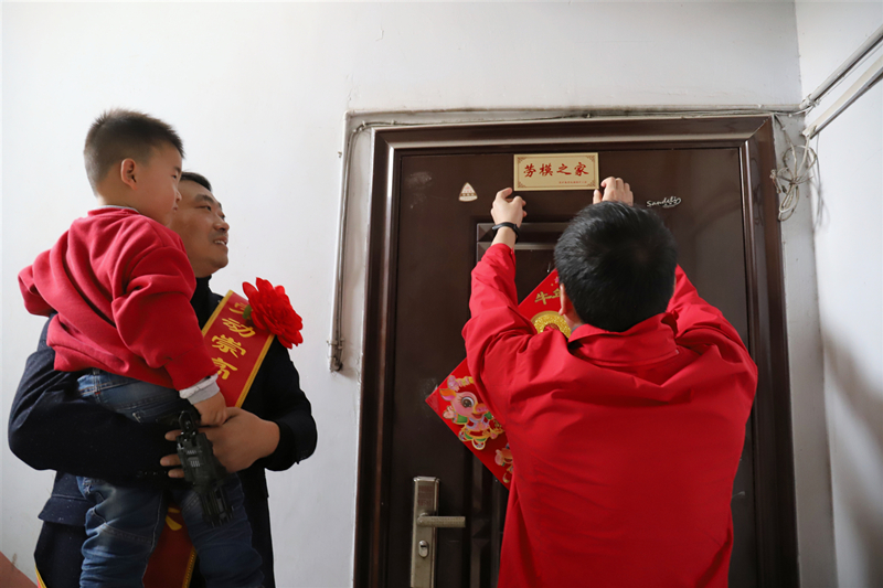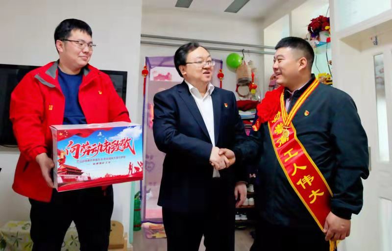 今年“五一”恰逢党史学习教育进行时。赵楼煤矿将“我为群众办实事”实践活动与弘扬劳模工匠精神、关爱尊重劳动者相结合,组织来到党员劳模周勇家中慰问,授花、送礼包,最后还给入户门贴上了“劳模之家”光荣牌。