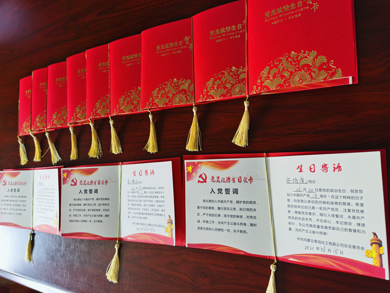 6月16日下午,鄂尔多斯能化荣信化工30名党员收到了一份特殊的礼物。这是一张“政治生日贺卡”:“徐延柱同志,6月14日是你的政治生日,祝贺你加入中国共产党12周年。”“希望你时刻牢记自己是一名共产党员,注重党性修养,增强党员意识,践行入党誓词,永葆共产党员先进本色,不忘初心、牢记使命,为公司高质量发展贡献自己的智慧和力量,为共产主义奋斗终身!”