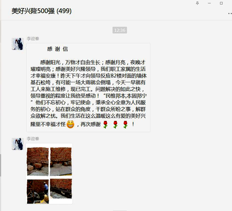 “七一”前夕,一封感谢信引爆美好兴隆:“昨天下午才反应82楼对面的墙体基石松垮,有可能一场大雨就会倒塌,今天一早就有工人来施工维修,现已完工。问题解决得如此之快,领导重视的程度让我倍受感动!他们不忘初心,牢记使命,秉承全心全意为人民服务的初心,站在群众的角度,干群众所盼之事,解群众欲解之忧……”