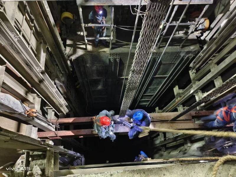 主井箕斗与副井罐笼检修同属井筒大型提升容器更换的“咽喉”工程,在矿井提升运输系统中起着举足轻重的作用。为确保工程安全高效进行,该队提前谋划、统筹部署,多次召开专题会议,细化施工工序,完善现场施工方案与安全技术措施。组织班组施工人员学习施工措施,明确施工准备、施工步骤、现场安全注意事项等。与此同时,在施工前对主副井提升系统进行风险评估和全面隐患排查,倒排工期,合理分工,严格执行现场交接班制度,通过设置现场标准化流程看板,进一步规范作业流程、管理流程,实现了检修现场规范化管理。井筒内作业时严格按照“联络清晰、落脚平稳、生根有力”的原则,在保证安全的前提下大大提升了施工进度,得到矿方好评。