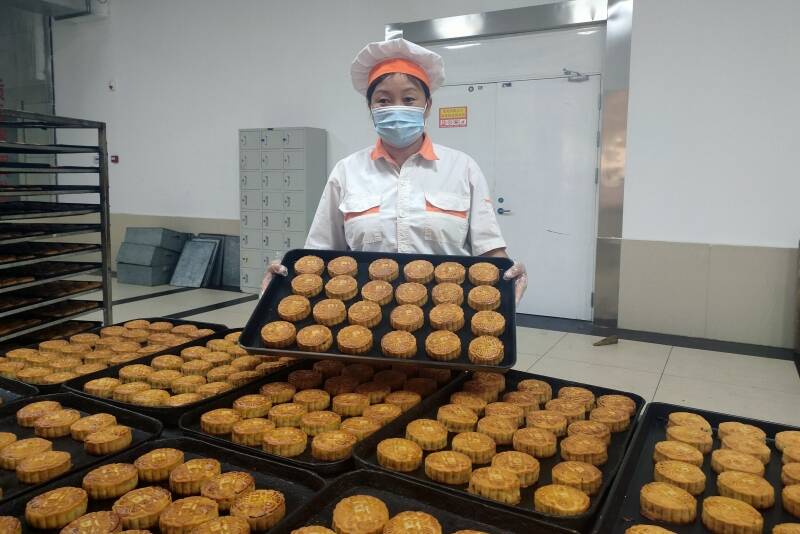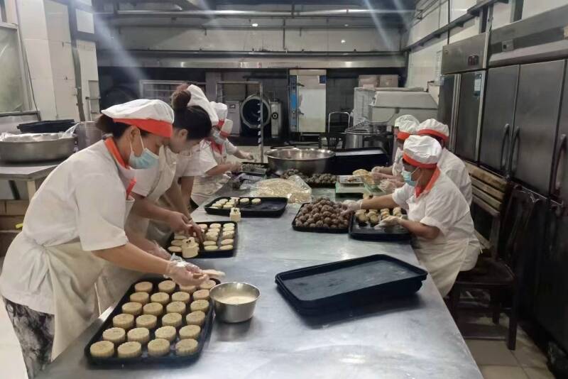 “做月饼主打选用上等食材,手工炒馅、精心调配,再加上每一份手工制作中的精巧用心。”面点班班长骆遵燕带领职工们身着工作服、戴着口罩,在各自工序上忙碌着。
