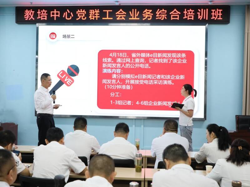 在党群工会业务综合培训班课堂上,授课专家通过案例分析进行,进行“桌面推演”,通过“小组对战”形式进行“角色扮演”,参训学员积极互动,模拟“某公司警卫室膜棚维修项目被网友发帖引起舆情”后,企业新闻发言人如何应对突发事件的过程。培训前预先将学员分成6个小组,每组选出小组长统筹分工,带领组员在5分钟内集体研商应对方案,并由1名组员代表团队现场演绎企业新闻发言人在突发公共事件现场的处置过程。通过头脑风暴,团队作战,学员们在“角色扮演”的过程中,增强了学员的关注网络事件的意识,提高了处理突发事件的能力。