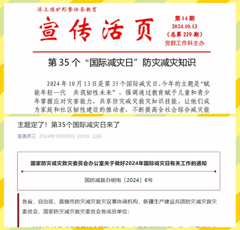 在第35个“国际减灾日”期间,济三煤矿围绕 “赋能年轻一代 共筑韧性未来”主题,开展形式多样的宣传活动,认真学习习近平总书记关于安全生产、应急管理、防灾减灾重要论述、指示批示精神,认真学习上级部署要求,对矿井冬季三防等防灾减灾工作进行了再安排再部署。