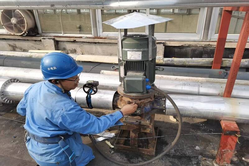 为了确保职工们能够拥有一个良好的洗浴环境,换热站3#电锅炉在10月25日就早早启动,为澡堂供暖。由于管道压力不足,更衣室温度刚开始达不到标准温度,检修人员迅速采取行动,在供暖管道上加装了11KW的循环泵加快水循环。经过改造,更衣室的温度明显提升,有效地防止了浴室和更衣室温差过大对职工身体健康的影响。