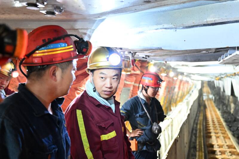丁奇在石拉乌素井下4-1煤2号仓号泄水巷进行现场交流提醒技术人员。