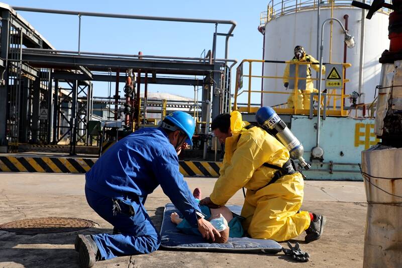 此次演练模拟甲醇车间甲醇贮槽单元突然发生阀门泄漏,一名巡检人员中毒晕倒,公司立即启动应急预案展开救援的过程。演练过程中,各应急抢险小组各司其职、协同作战,人员救治、漏点处理、喷水稀释……各项工作有序展开。