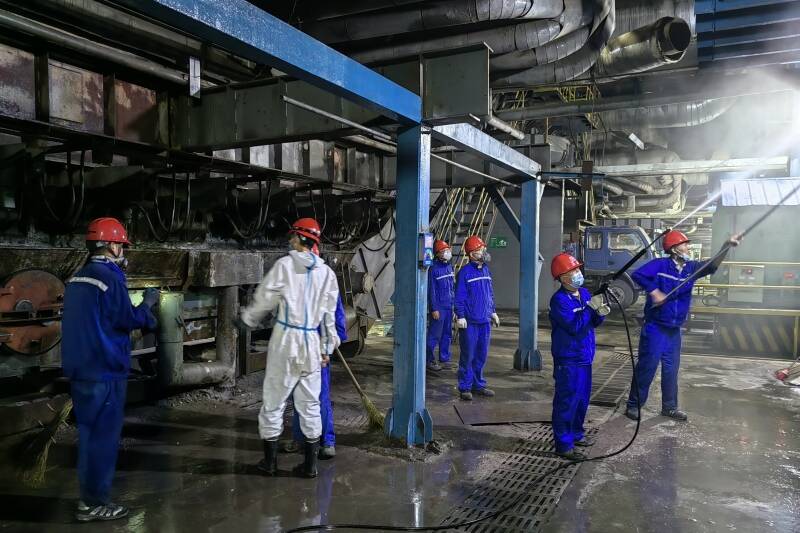 第一步:大清扫。从锅炉炉顶开始逐层到锅炉本体,再到锅炉八米平台和零米基础平台,该车间党员干部每天分组、分区域、分层推进,顺利完成了对锅炉顶部和本体表面积灰的清理,为后续高效清理打好基础。第二步:大清洗。抓住两台锅炉双重安全备用窗口期,组织人员从锅炉顶部开始,逐层对锅炉本体和设备本体表面的剩余浮灰进行彻底的冲洗,两台锅炉从上至下焕然一新,再次露出了金属和保温光泽。第三步:大清运。经过对锅炉顶部和逐层的彻底清扫和冲洗后,多年累积的灰垢全部积存在零米基础层,待污泥逐步硬化后,热电车间全体出动,仅用两天时间就将零米层积垢彻底清理完成。在此基础上,该车间管理人员积极利用高压清洗机和除垢剂,对部分动设备本体和死角盲区进行彻底清洗。
