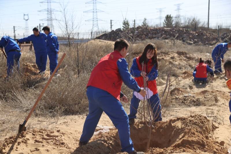 播种绿色希望,共建美好未来,4月2日,公司40余名劳模、党员、团员和青年职工志愿者齐聚毛乌素沙地。平日里,他们是操控阀门、敲击键盘的化工能手,此刻,他们化身为播撒绿色的使者。大家分工明确、配合默契,挥锹铲土时动作娴熟,扶正树苗时小心翼翼,培土浇水时认真细致,每个环节都衔接有序。