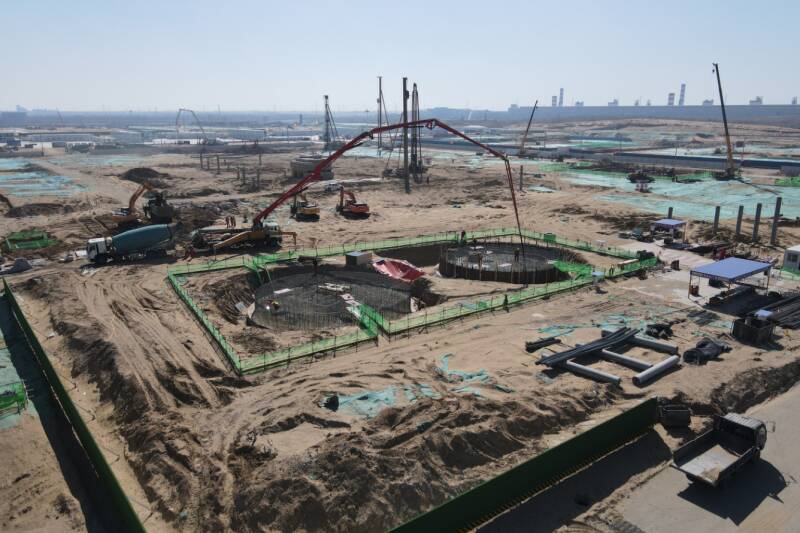 目前,公辅装置厂前区中心控制室、浓盐水缓冲池、维修厂房和危化品库基础土方开挖完成,甲醇制烯烃装置201#管桥模版支设正在进行,聚丙烯装置污水收集池开始降水,聚乙烯装置己烷罐、母液罐基础承台钢筋正在绑扎……在他们挥汗如雨的劳作中,纸质施工图正一点一点变成现场实景图。
