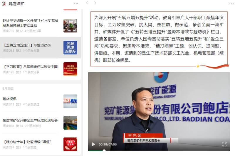 近日,一档访谈节目《“五转五增五提升”暨降本增效专题访谈》在鲍店煤矿微信公众号刊发后,引起了广泛的关注和热烈的讨论。