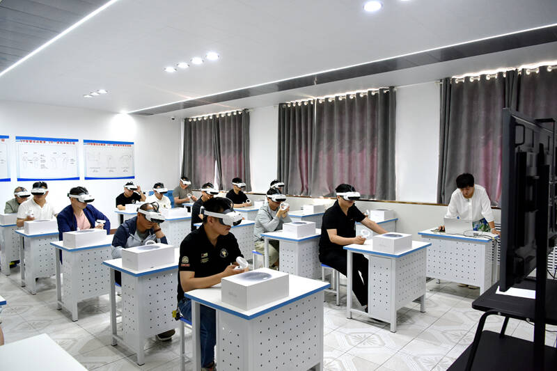 “大家按照老师的讲解,戴好VR头盔,拿起模拟手柄,点击选择液压支架工,就可以开始操作了。”